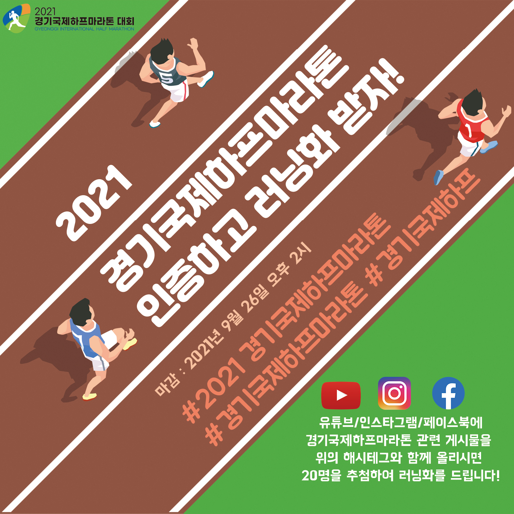 유튜브, 인스타그램, 페이스북에 경기국제하프마라톤 관련 게시물을 아래 해시테그와 함께 업로드하시면 20분을 추첨하여 러닝화를 드립니다!