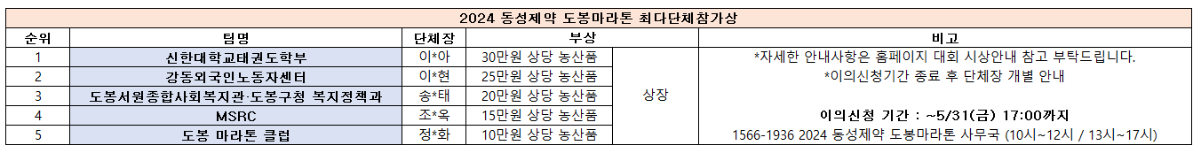[최다단체참가상 입상팀] 2024 동성제약 도봉마라톤대회 최다단체참가상 입상팀 안내