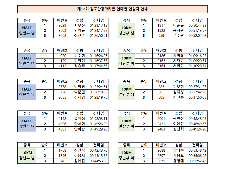 [연령별 입상자] 제12회 김포한강마라톤 연령별 시상 입상자 안내