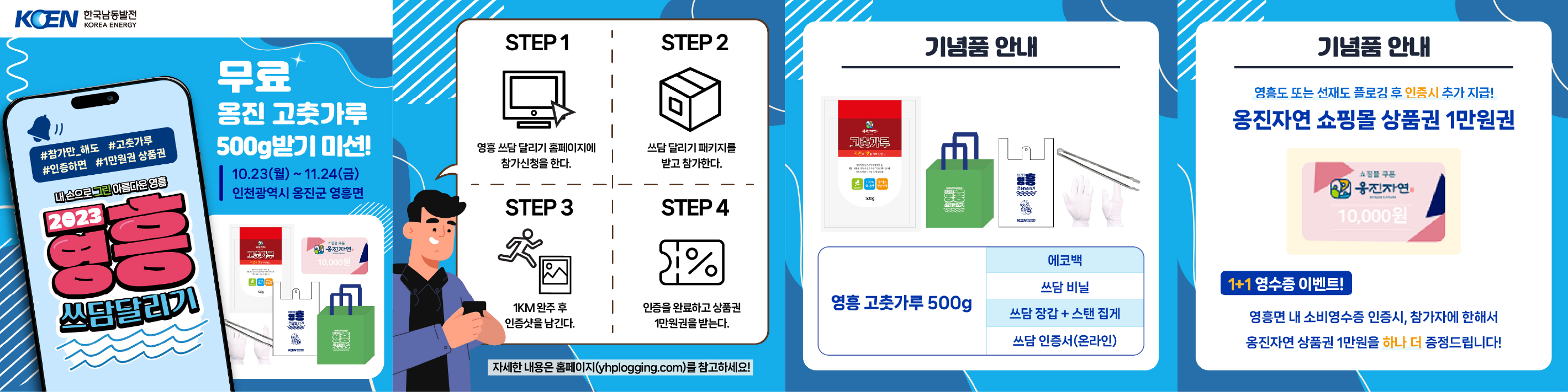 기념품 : 영흥 고춧가루(500g), 에코백, 장갑, 집게, 친환경봉투 +영흥면(영흥도, 선재도) 인증 시 옹진자연 1만원권 상품권