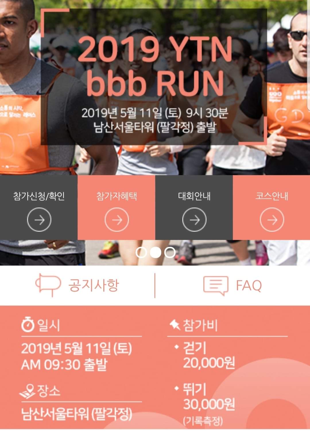 안녕하세요. 5월 11일 남산에서 새로운 RUN 새로운 걷기대회인 YTN bbb RUN이 개최 됩니다. 많은 성원 바랍니다.